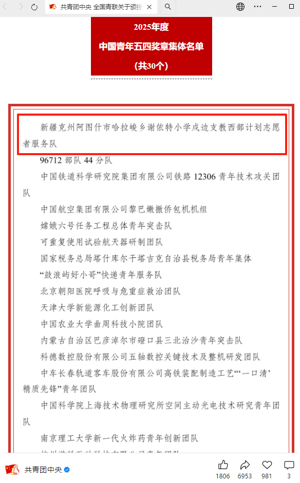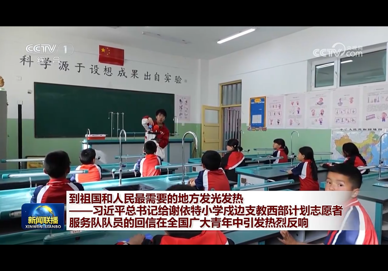 2025年5月4日,中央电视台新闻联播在报道“祖国和人民最需要的地方发光发热——习近平总书记给谢依特小学戍边支教西部计划志愿者服务队队员的回信在全国广大青年中引发热烈反响”中展播了姚智戈支教课堂情况。