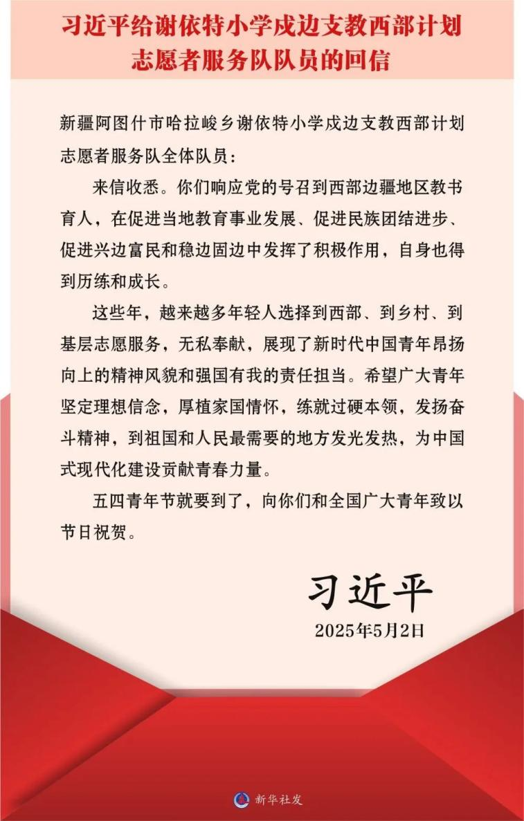 总书记的回信温暖人心、催人奋进,极大激励了姚智戈和谢依特小学戍边支教西部计划志愿者服务队全体队员。姚智戈说,“总书记的回信字字千钧,让我心潮澎湃。作为获得全国五四青年奖章的西部计划志愿者服务队,我们肩负着时代赋予的使命,应当积极响应号召,在教育事业中全力以赴,做好带头示范作用,不断锤炼工作能力,提升教学水平,把总书记的殷切期望转化为服务乡村教育发展的具体行动,用青春奋斗书写最美的边塞诗。”