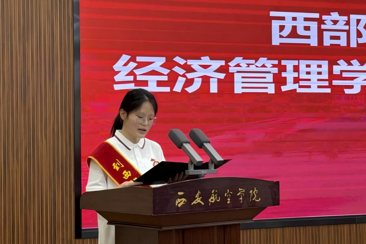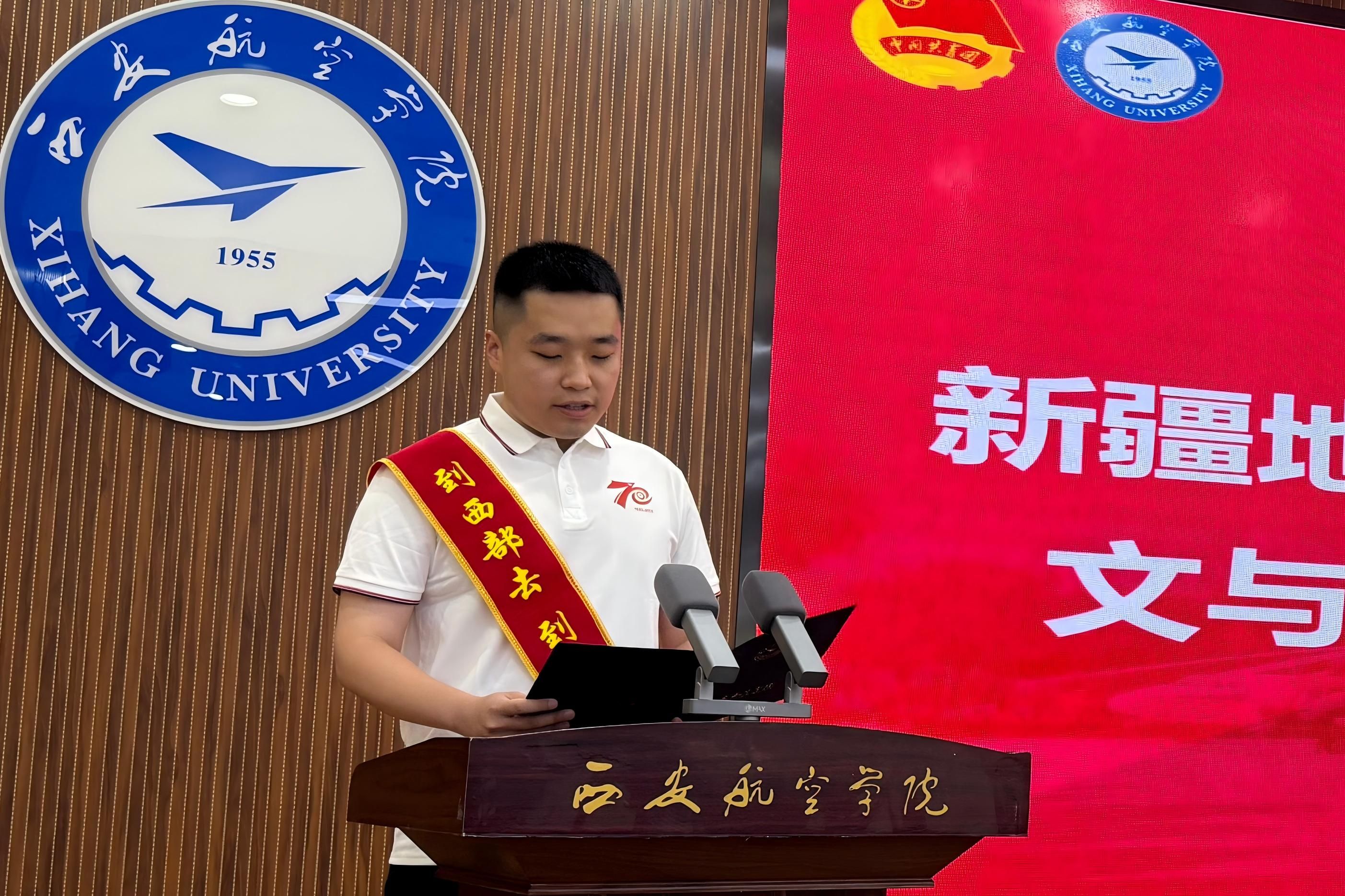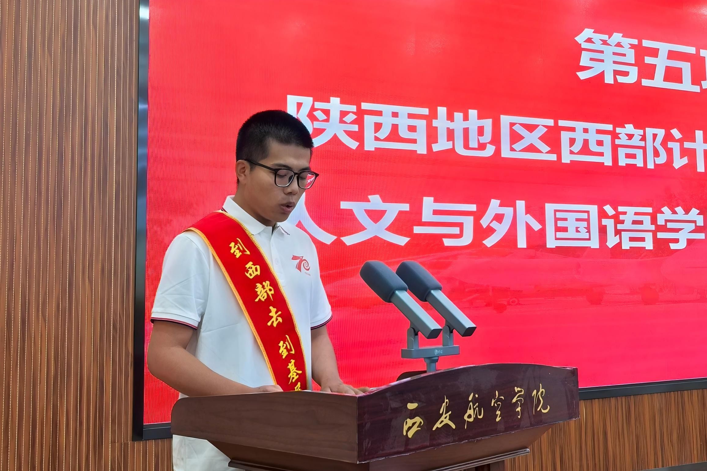 2025年西部计划志愿者代表人文与外国语学院王泽宇、王文学分别结合自身的成长经历、服务祖国西部建设的梦想与志向相继作了发言;经济管理学院李虎妮同学带领全体西部计划志愿者发出倡议书,用铿锵有力的声音抒发砥砺奋进、扎根西部的坚定决心。
