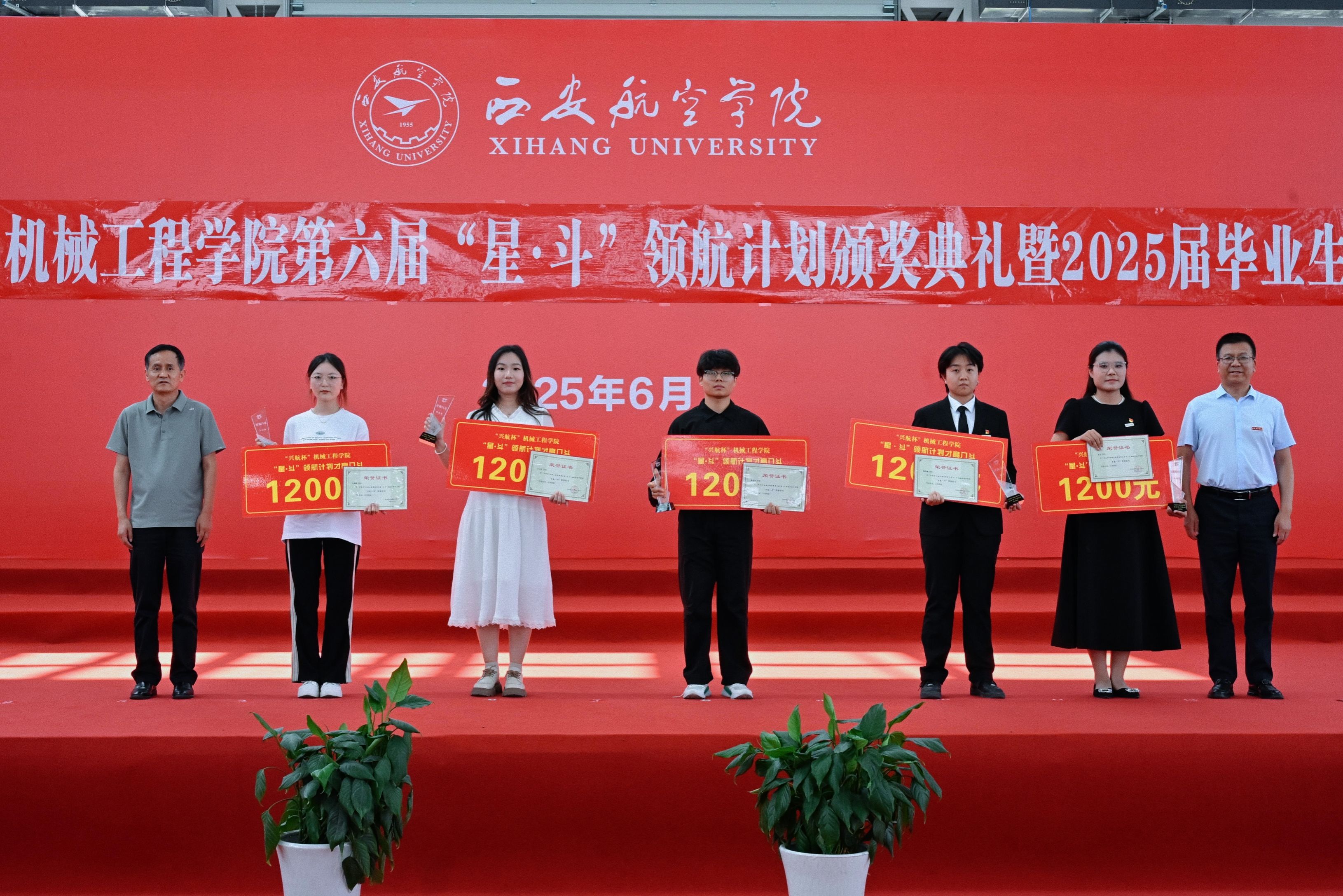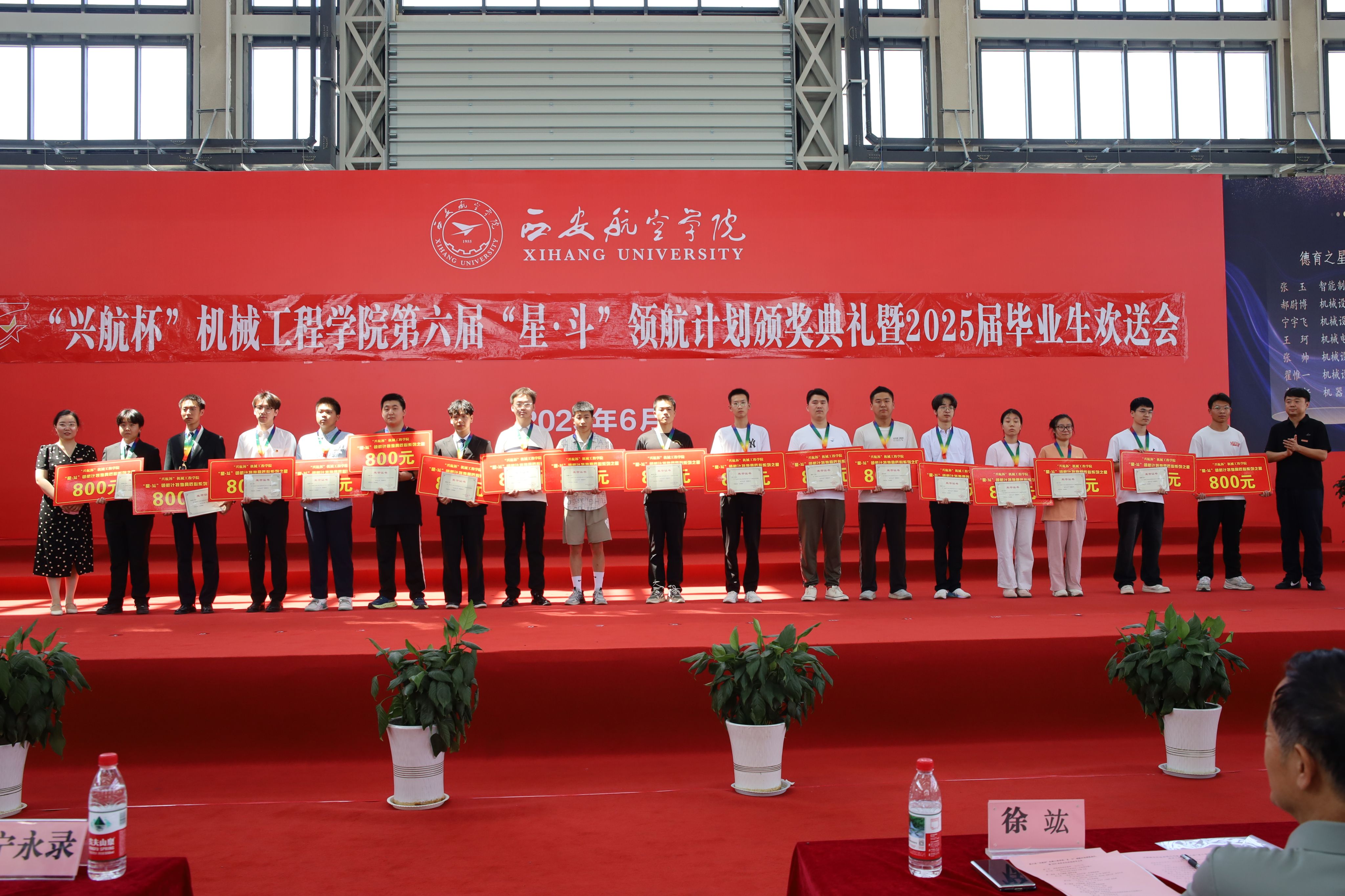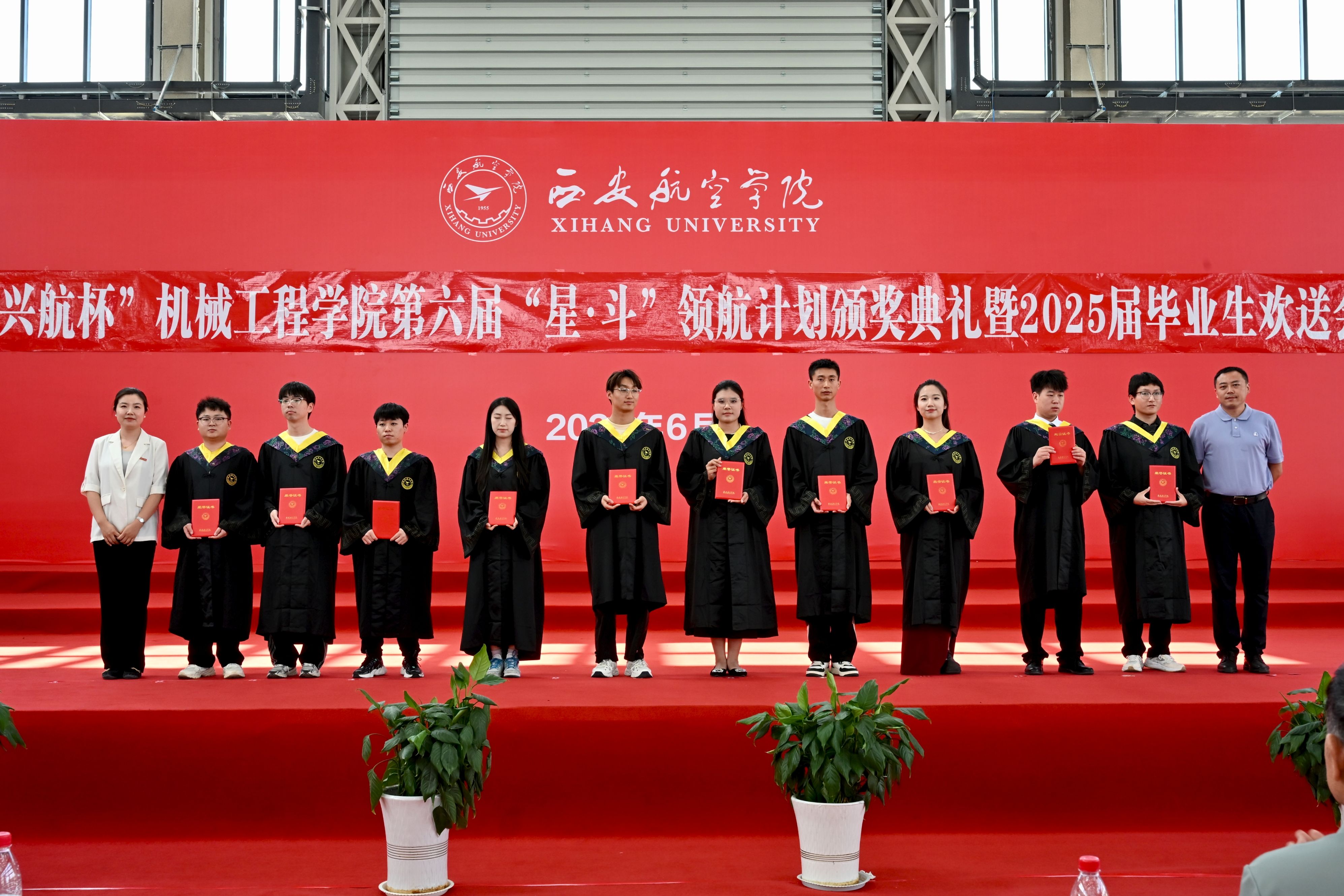 6月23日下午,机械工程学院第六届“兴航杯”星•斗领航计划颁奖典礼暨2025届毕业生欢送会在阎良校区民航实验实训基地举行。西安兴航航空科技股份有限公司总经理徐竑、人事经理丁楠,校党委副书记宁永录,党委组织部、学生工作部(处)、教务处、图书馆、体育部、校办工厂等部门负责人,以及机械工程学院全体干部、师生代表共同出席典礼,见证荣耀时刻,共叙师生情谊。