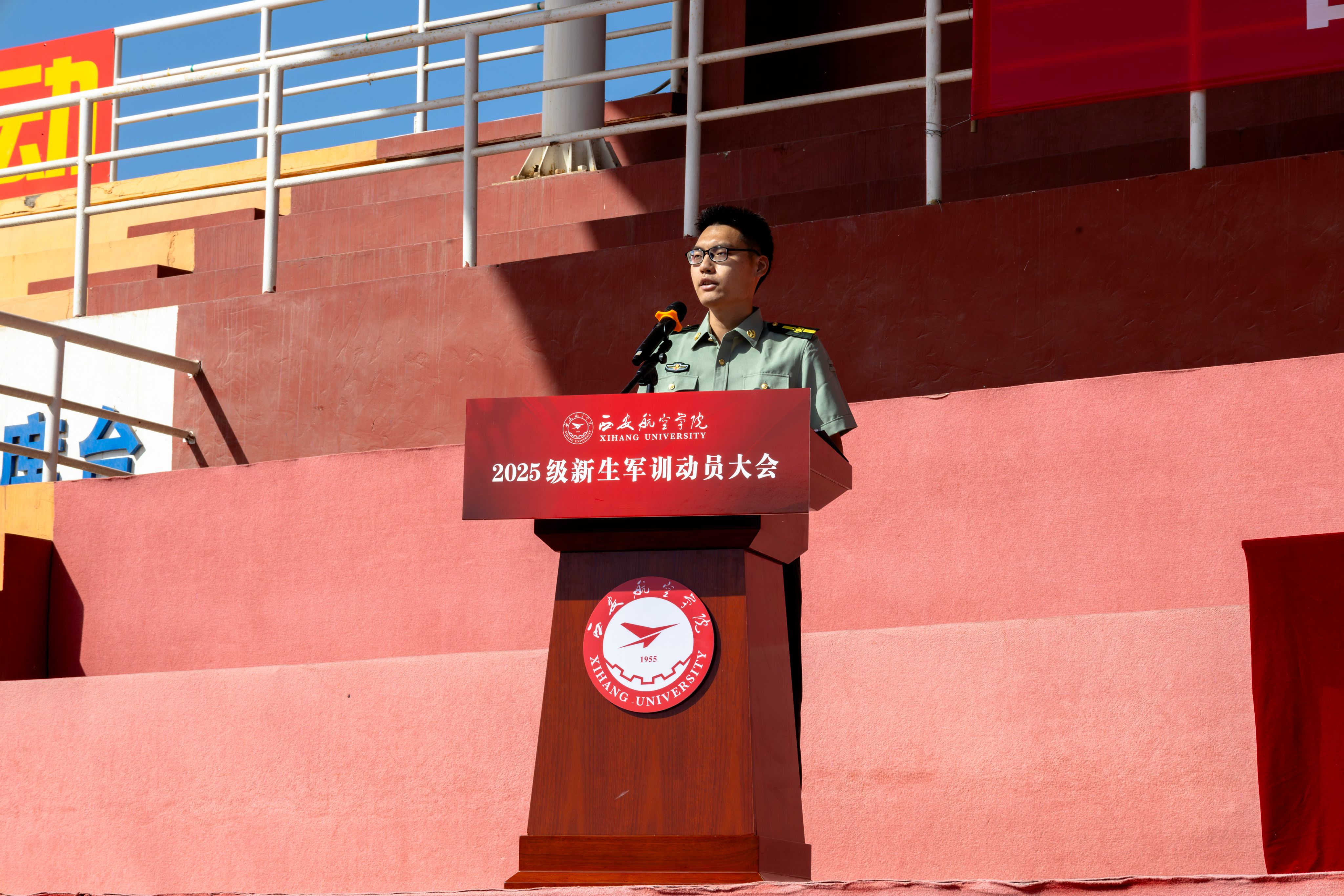 人文与外国语学院商英252班高靖泞、民航学院航服252班周欣晨代表2025级新生发言,承诺在军训期间严格要求、服从命令、听从指挥,努力完成训练任务,倡议同学们严守纪律、刻苦训练、积极应对挑战。