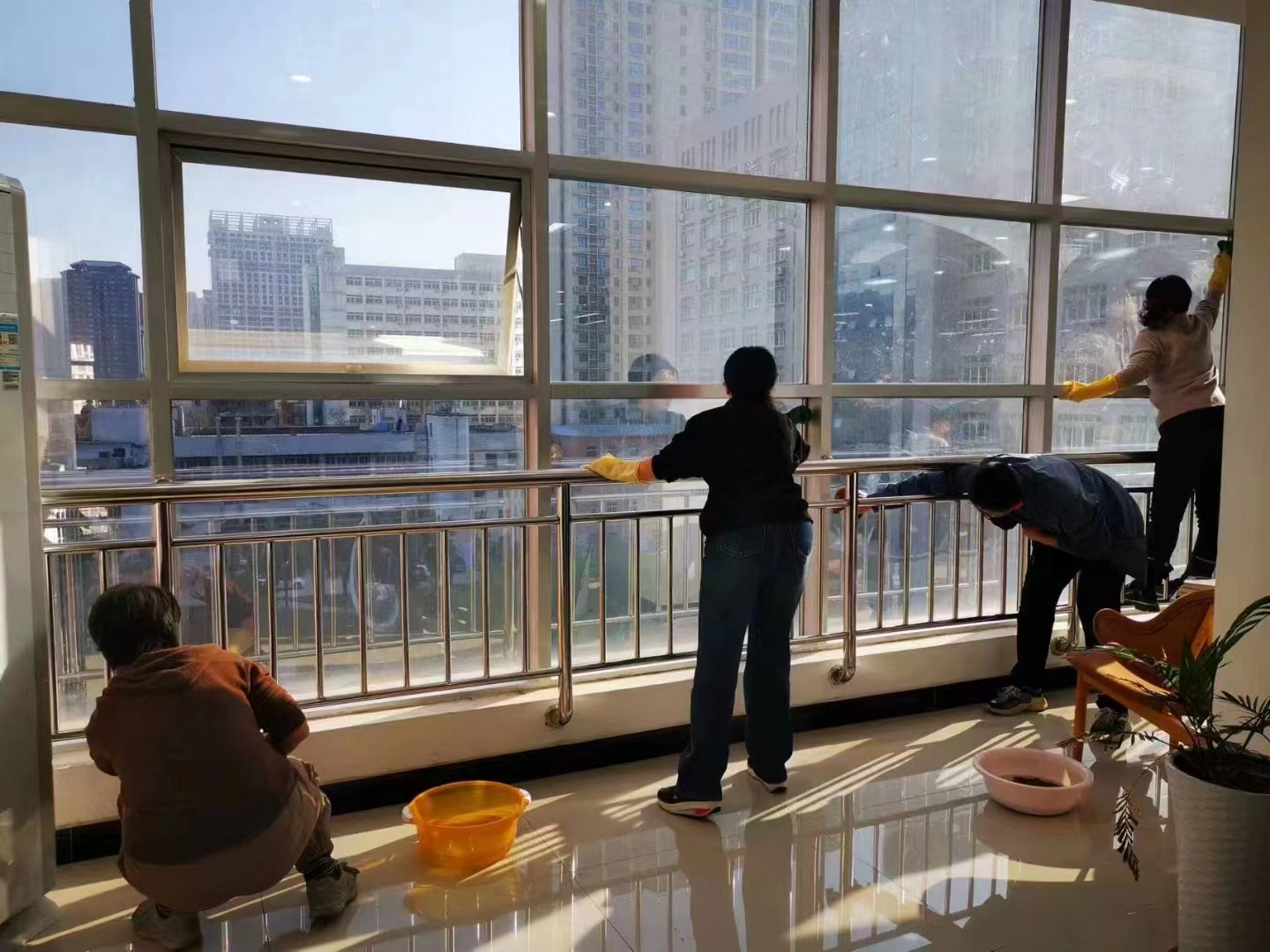 支部全体党员和学生助理馆员对图书馆入口玻璃幕墙,一楼和五楼读者阅览公共空间的窗户玻璃擦拭清洁。活动中,每一次擦拭都透露出对图书馆党员对细节的关注,大家手持抹布,细致入微地擦拭每一块玻璃,彰显出对读者服务用心。党员们发扬不怕苦和累的精神,彻底清除了棚顶长期积累的灰尘,清理了门框和墙壁上的广告胶痕。经过努力,图书馆大门玻璃光明透亮,窗户洁净如新,馆舍门面环境得到较大的提升。
