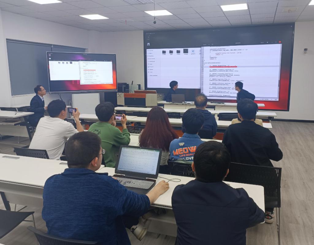 翔腾公司秦翔从AI技术在行业中丰富的应用落地实践展开介绍,引入NPU等AI芯片的功能和优势的讲解,详尽展示了超强算力、边缘神经网络推理芯片(NPU)与应用场景特征密切相关应用以及在多种复杂智能场景适配芯片丰富的软硬件生态等方面的亮点和优势,开拓了人工智能生态在航空产业等领域融合的思路。此后,翔腾公司工程师团队展示了开发硬件结构、软件开发具体操作,并且现场导入开发程序,详细演示智能识别场景应用的实际效果,并通过翔腾多个合作项目的展示,让教师们充分了解到智能应用落地的实际现状。