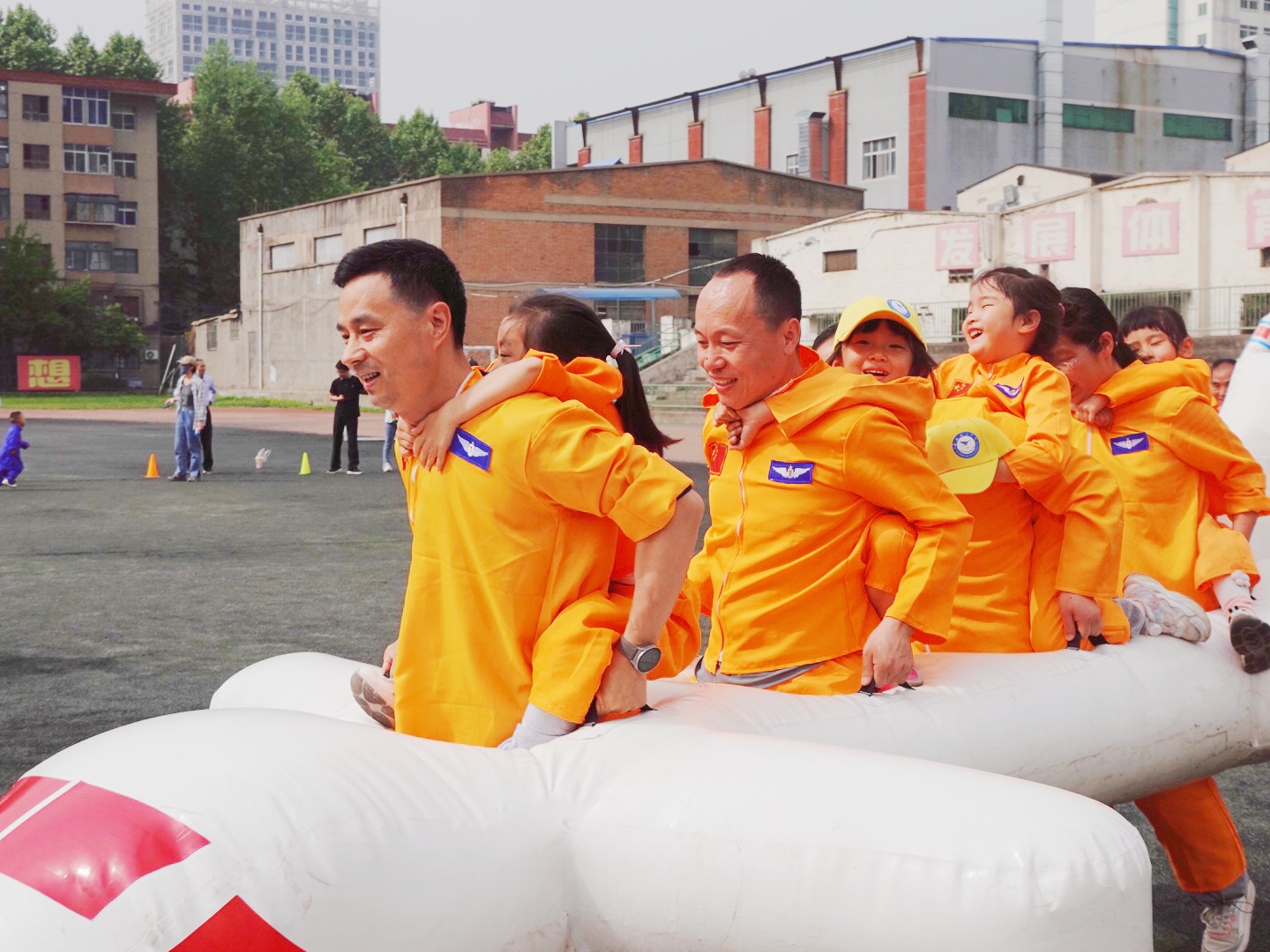音乐响彻运动场,运动会正式拉开帷幕。活动以“火箭直冲云霄、航天飞机、宇宙飞船、遨游太空、筑梦蓝天”等多种游戏的形式向孩子们宣传科学、普及航空航天知识。形式多样的亲子游戏,让赛场成为欢乐的海洋。幼儿和家长在游戏中尽情欢乐、尽情释放、尽情探索,在锻炼肢体协调性和灵活性的同时,激发出更多的运动潜能。孩子们不仅增进了彼此的友谊,还促进了亲子间的情感交流。相信孩子们在游戏竞技中也能更好领会航天人的艰苦奋斗、勇于探索、开拓创新的精神,学习航天人严肃谨慎、志存高远、无私奉献的品质和高度的责任感。
