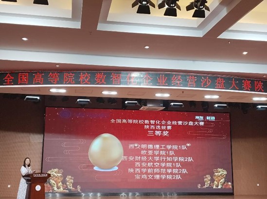6月23日,由中国商业联合会、新道科技股份有限公司主办的第二十届全国高等院校数智化企业经营沙盘大赛陕西选拔赛在西安交通工程学院举办,伟德官网由经济管理学院财务管理专业陈可盈、贺紫怡、李佳璇,电子商务专业刘宇轩组成的伟德bv国际体育1队及财务管理专业张雪祎、王珍琦、杨茜茜、张依帆组成的伟德bv国际体育2队,在辛玥、潘媛两位老师的指导下,经过激烈角逐,最终荣获省级二等奖、三等奖各1项的好成绩。