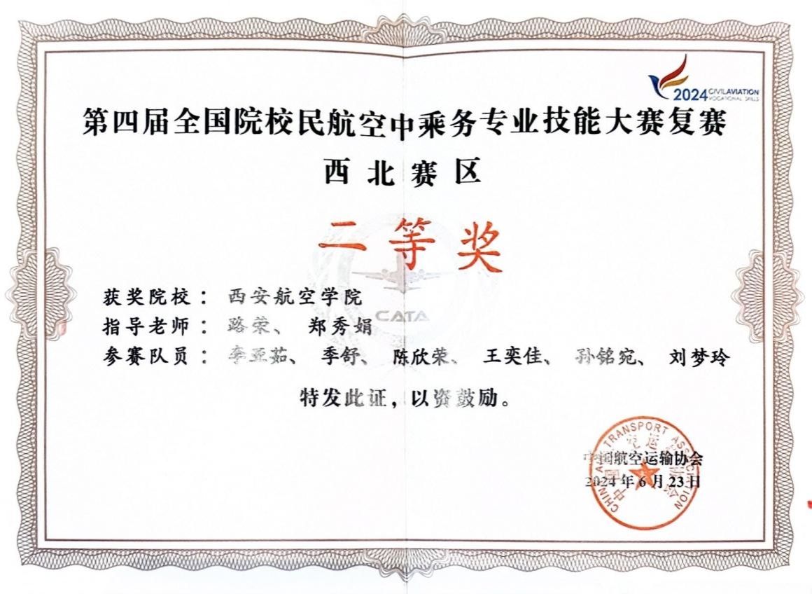 6月21至23日,民航学院教师路荣、郑秀娟带领航空服务艺术与管理专业李亚茹、陈欣荣等六位学生参加中国航空运输协会主办的第四届全国民航院校空中乘务大赛西北地区复赛,取得佳绩。
