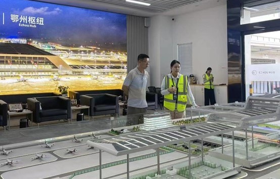 班奕一行在顺丰花湖机场现场工作人员引导下观看了顺丰鄂州枢纽宣传片,观摩了鄂州花湖国际机场货运业务运作流程沙盘模型,参观了机场国内货运区与国际货运区并与企业方代表进行了座谈交流。