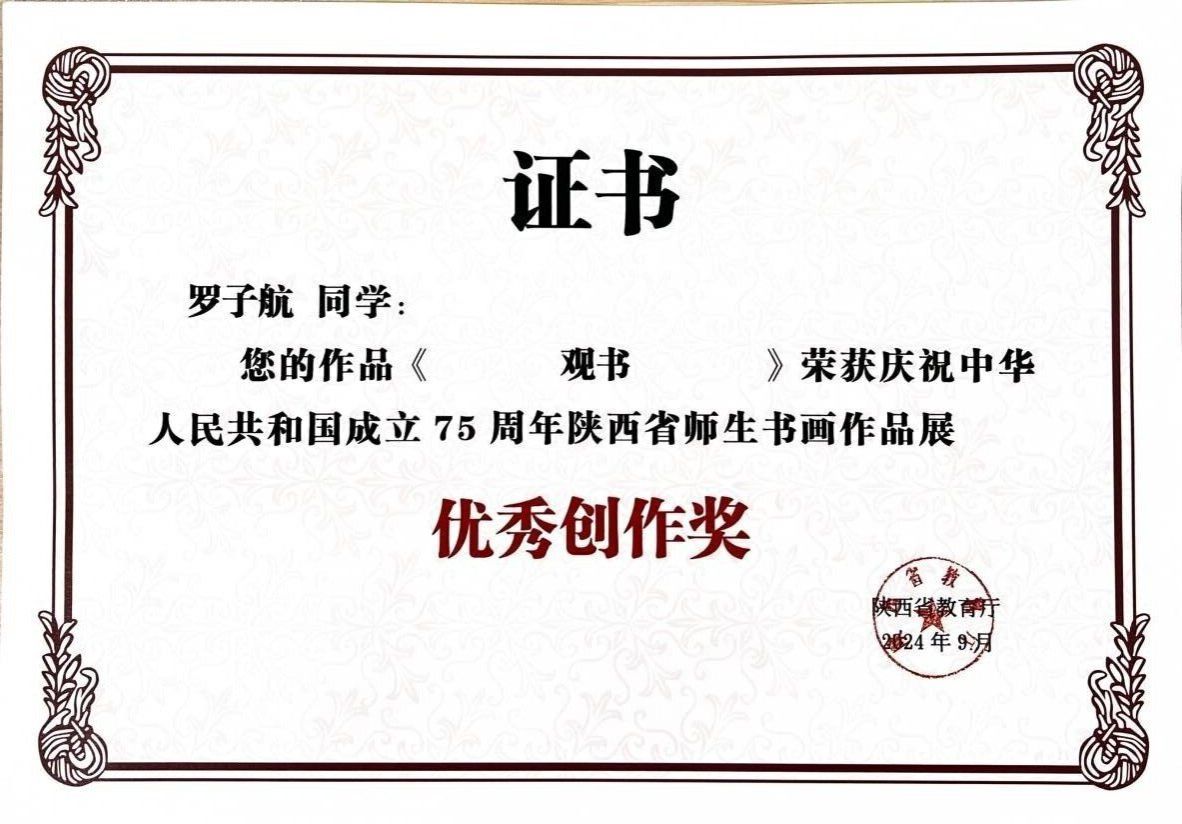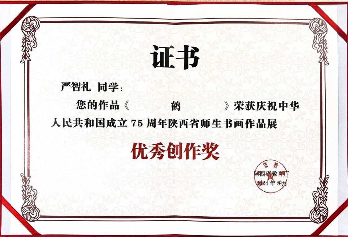 近日,伟德官网人文与外国语学院(公共艺术教育中心)黎长鑫、罗子航、严智礼三名同学的书法、版画作品获“庆祝中华人民共和国成立75周年陕西省师生书画作品展”优秀创作奖。