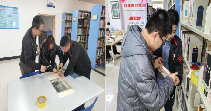 第二阶段全体党员划分为馆舍家具维修、绿植养护、图书与环境修缮三个小组,逐个排查馆内书架、阅览桌椅、门窗限位器等缺损,逐一用工具修复。对枯黄的绿植进行养护、移栽,修复图书标签、条码破损等问题,通过一个多小时的劳动,书架、桌椅等重新稳固,枯黄绿植焕发生机,美化了阅读空间,为读者营造舒适的环境。大家虽有疲惫却满是自豪,以实际行动为馆舍注入新活力,践行服务师生初心。