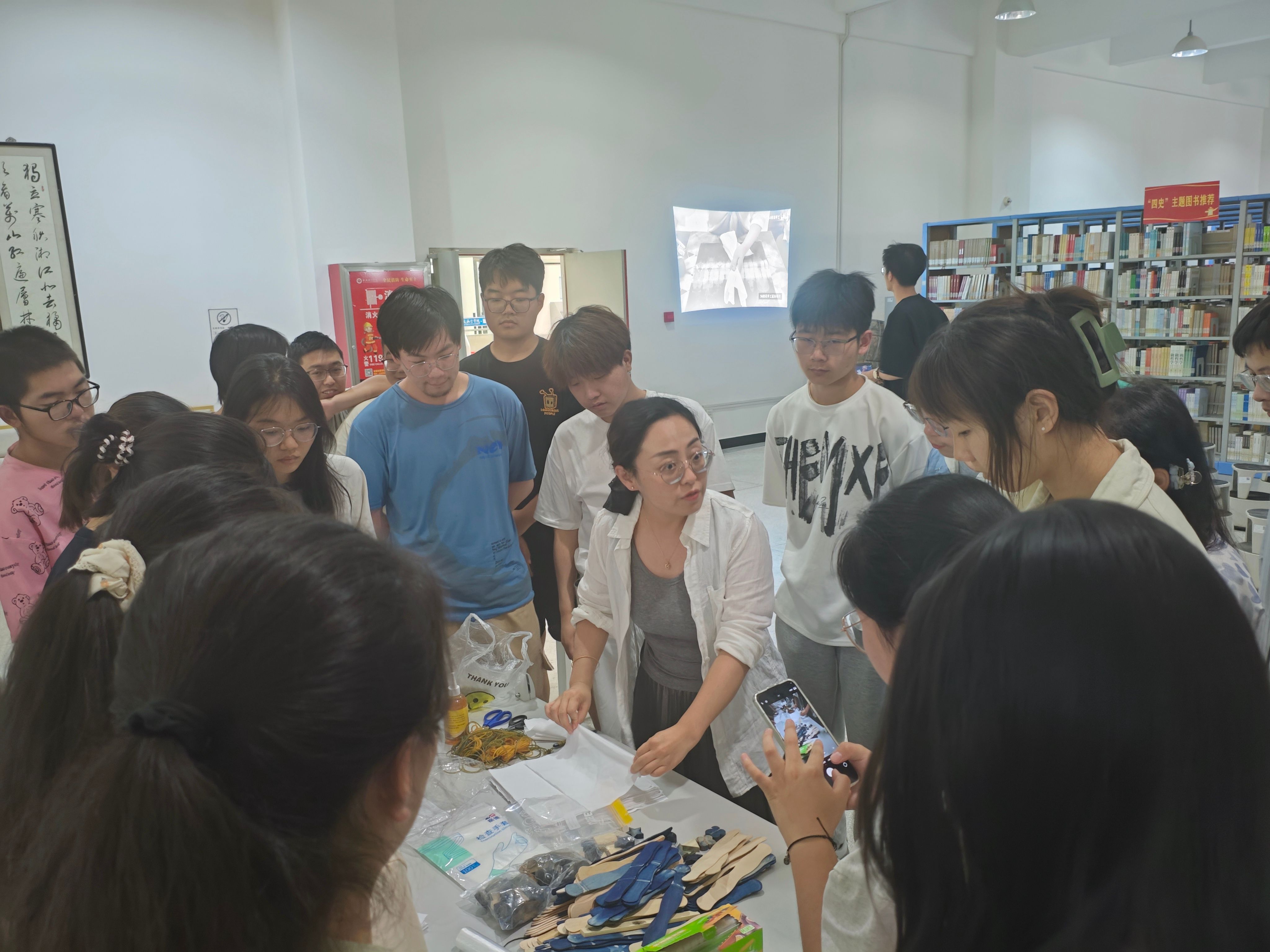 活动分为文化传承、技艺学习和创意实践三个环节。开场环节,读者协会的杨世雄同学用PPT加视频的形式介绍了扎染工艺从春秋战国时期至今的发展历程和文化价值。