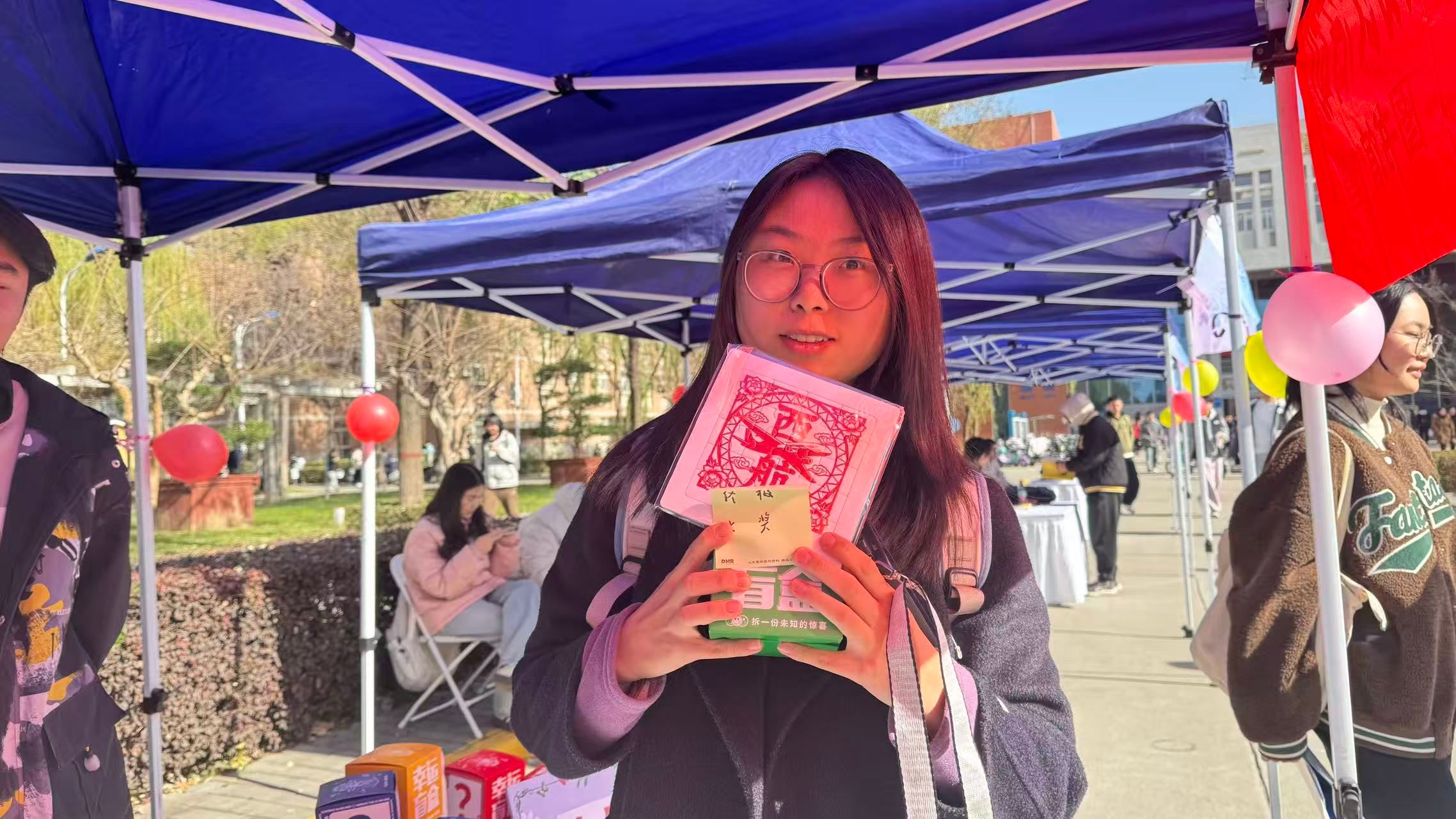活动现场设置了知识竞答区、盲盒抽取区和时光胶囊书写区。同学们通过抽取竞赛题目,回答涵盖非物质文化遗产与图书馆服务的相关知识。答题正确者可参与盲盒抽取,获得图书馆文创拼图、书签、明信片等精美文创产品。