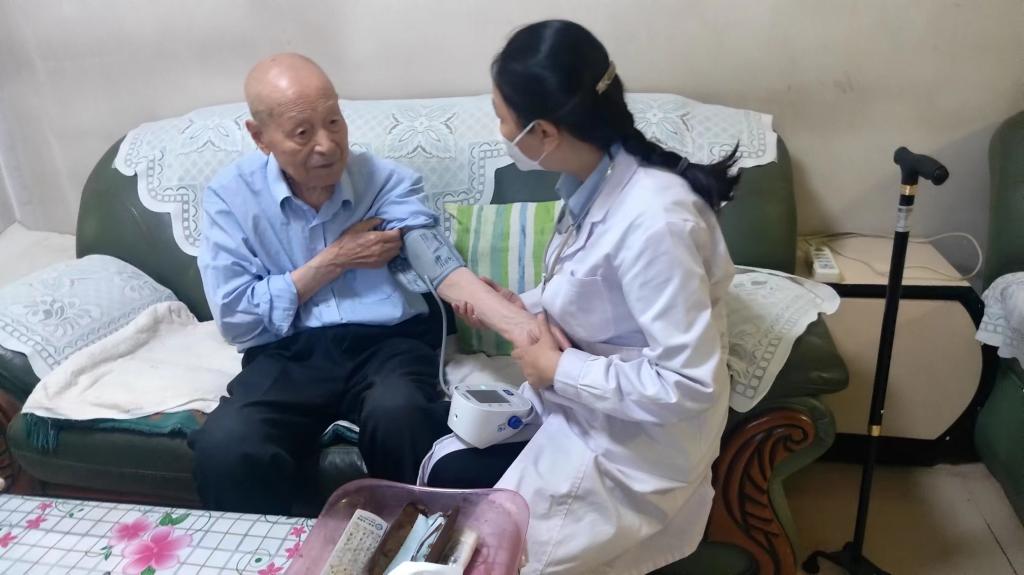 校医院医生孙宝洁细致地为他们听诊、测血压,耐心询问老人身体状况,详细了解四位离休干部的日常身体状况和健康保健需求,给出了有针对性的健康指导和保健建议。孙医生根据血压、心、肺听诊的结果及老人的自我症状、个体化需求,从医疗、护理、用药合理性等方面进行了耐心细致地指导。