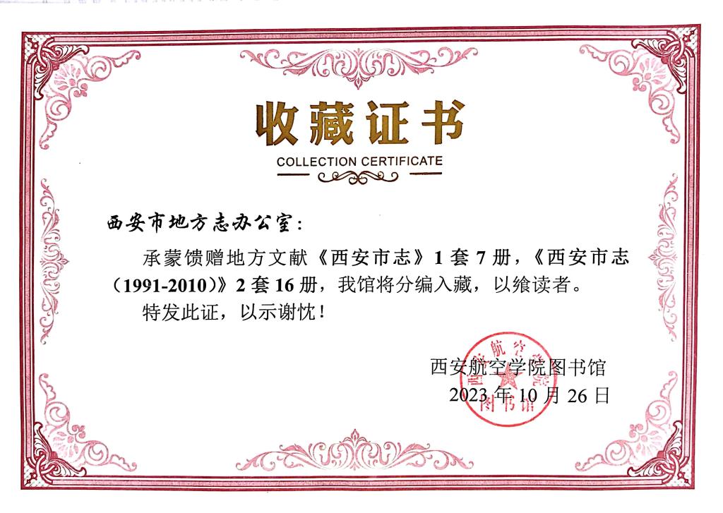 近日,西安市地方志办公室向伟德官网图书馆捐赠《西安市志》《西安市志(1991-2010)》等史志书籍23册,图书馆接受赠书并向西安市地方志办公室颁发收藏证书。