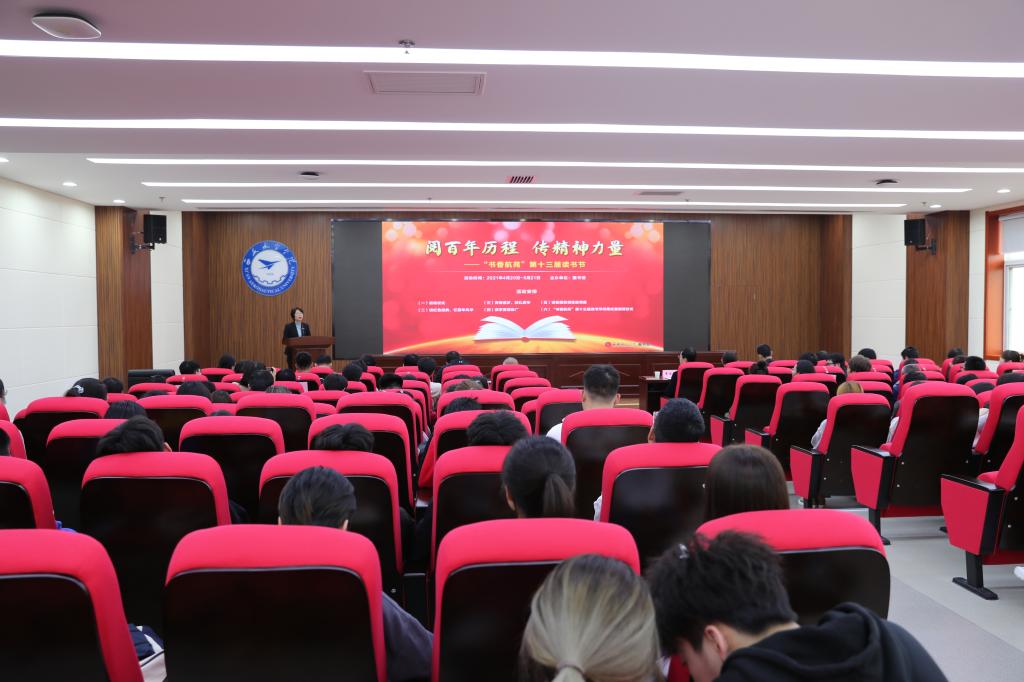 该校图书馆馆长郑东红主持启动仪式并致开幕辞。她表示,今年两会召开,“全民阅读”第八次被写入政府工作报告,《中华人民共和国国民经济和社会发展第十四个五年规划和2035年远景目标纲要》在“提升公共文化服务水平”一章中专门提出“深入推进全民阅读,建设‘书香中国’”。中宣部近日也印发《关于做好2021年全民阅读工作的通知》,对2021年全民阅读工作作出了全面部署。图书馆积极响应中国图书馆学会号召,以“阅百年历程,传精神力量”主题,结合党史学习教育,组织开展 “书香航苑”第十三届读书节系列活动,希望广大师生积极参与,学史明理、学史增信、学史崇德、学史力行。