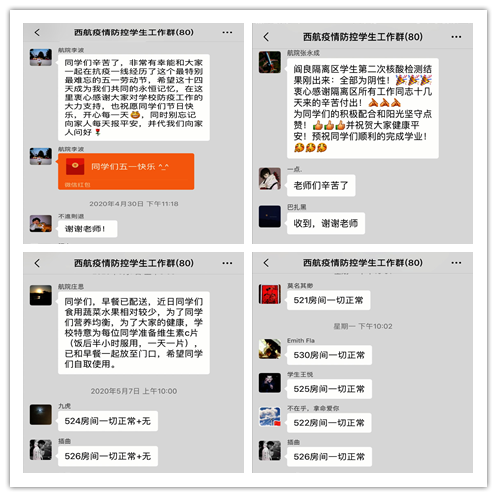 自动化2012 刘午虓:疫情无情人有情,很庆幸自己成为西航学子,十四天的关怀无微不至,十四天的照顾体贴温馨,隔离期间让我感受到家的温暖,从住宿环境,饮食起居到贴心服务都非常棒。感谢隔离工作人员的辛勤付出,感谢西航师生的关心照顾,在此祝愿所有在隔离区的同学们,坚持住,一切都会过去!加油!