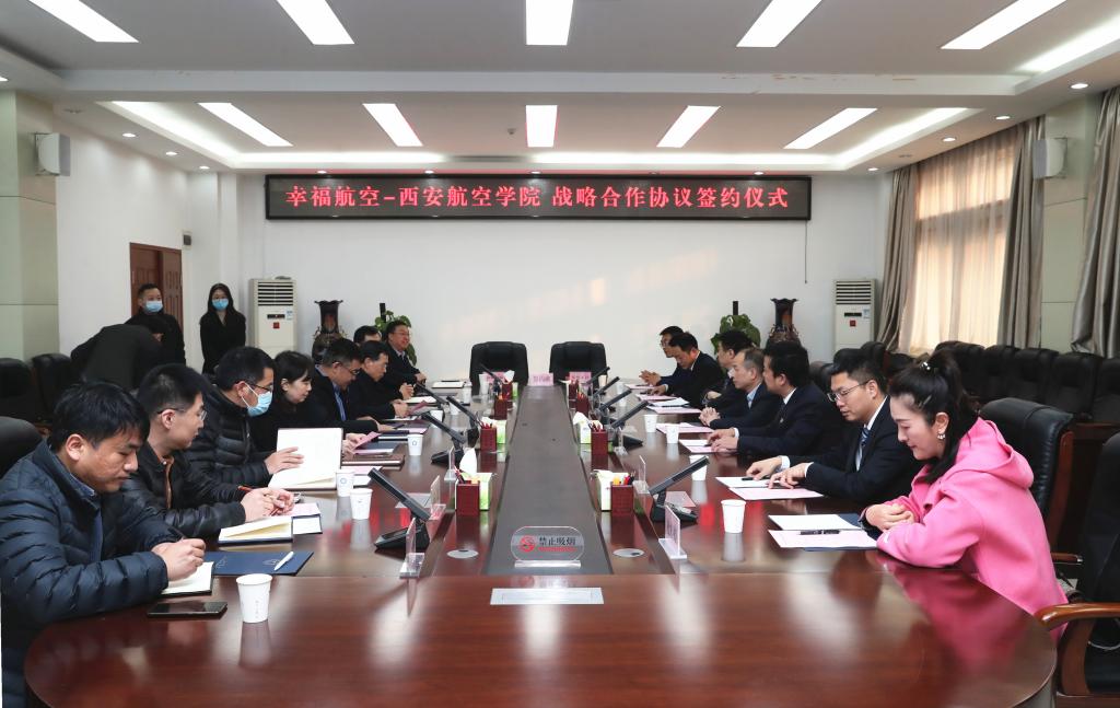 近日,伟德bv国际体育与幸福航空有限责任公司战略合作框架协议签约仪式在莲湖校区教学楼九楼会议室举行。西安航投党委委员、副总经理罗奕凯,幸福航空党委书记、执行董事彭仕兵,幸福航空党委委员、副总裁兼安全总监汪显斌,伟德bv国际体育校长祁玉龙,副校长宋文学、金文及相关部门负责人参加了签约仪式。仪式由宋文学主持。