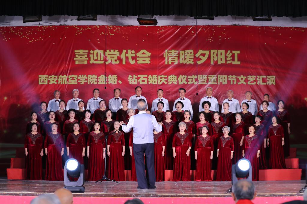 庆典仪式后,进行了离退休职工重阳节文艺汇演。演出在大合唱《夕阳红》和《领航》的歌声中拉开帷幕,歌舞《唐宫夜宴》《你向桃花三月开》,锅庄舞表演《吉祥班玛》,现代舞蹈 《第一天》,旗袍表演《水墨中国》,太极拳表演《天边》,柔力球表演《中国龙》,独唱《永远跟你走》,以及器乐合奏《双脚踏上幸福路》和葫芦丝联奏《山丹丹开花红艳艳》等精彩演出,赢得现场观众掌声阵阵,演出过程中还分享了钻石婚代表郑泽尧和李瑞玲夫妇,金婚代表王书让和张丽荣夫妇的婚姻历程,将校园尊老敬老氛围推向高潮。