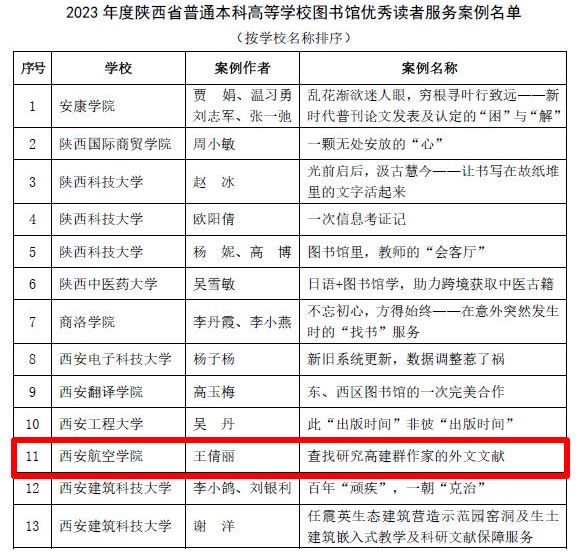 2023年读者服务案例共征集到34所本科高校图书馆提交的186个案例,经过陕西高校图工委服务创新工作组对案例进行了初评,共有60个案例入围,伟德官网图书馆申报的案例成功入选。入围案例经过提交PPT演示文件、现场演示与交流、参加优秀服务案例终评,共评选出31个优秀案例,伟德官网图书馆申报的《查找研究高建群作家的外文文献》被评选为优秀案例。
