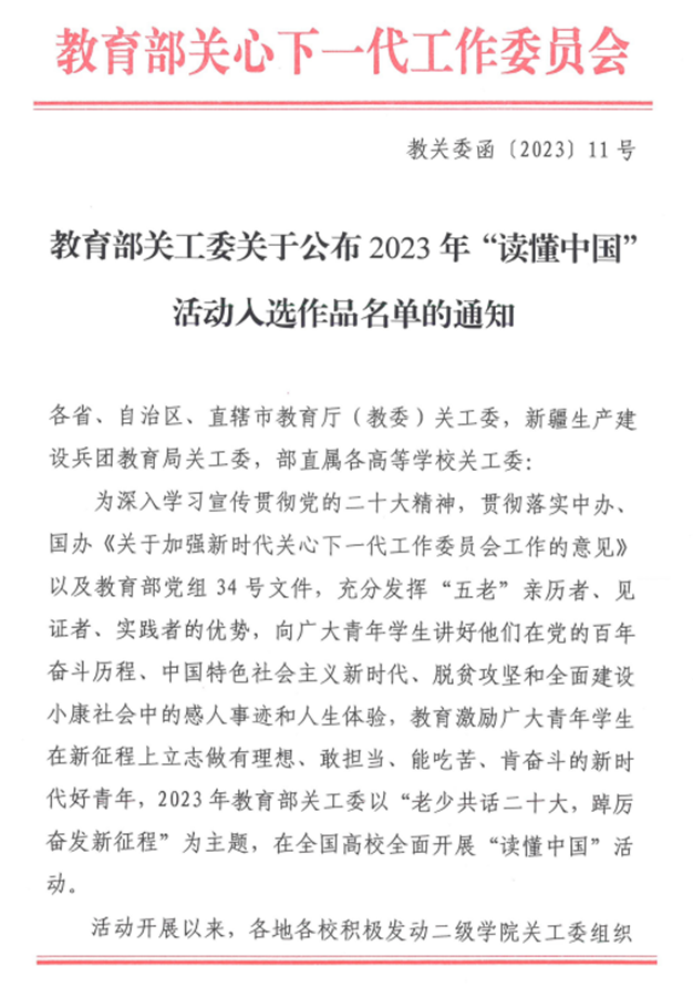 教育部关工委“读懂中国”活动为学校思政课程和大思政校园育人提供了鲜活素材,实现以人物故事涵养家国情怀,有效增强“读懂中国”活动影响和育人效果。在此向所有关心支持学校关工委工作的领导和同志们,向积极参与关心下一代工作的“五老”以及参与“读懂中国”活动的二级学院关工委和同学们表示感谢和祝贺。(文、图/离退休工作处 胡昊 审核/史正元)