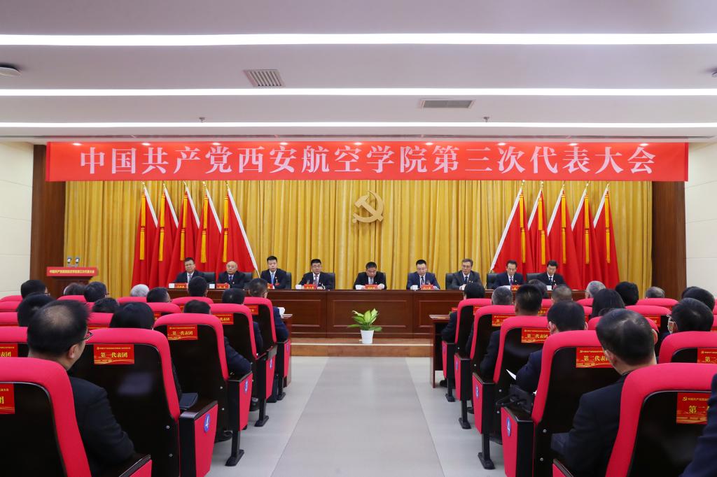 大会会场庄严肃穆、气氛热烈,主席台上方悬挂着“中国共产党伟德bv国际体育第三次代表大会”的会标,主席台正中的党徽熠熠生辉,10面鲜艳的红旗分列两侧。会场正后方悬挂着“锐意改革创新,奋力追赶超越,谱写航空特色鲜明的高水平应用型高校建设新篇章”的横幅,鼓舞人心、催人奋进。