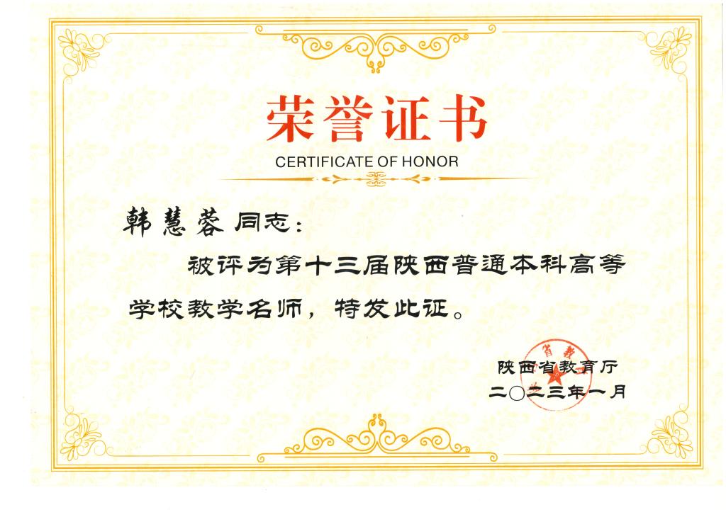 韩慧蓉荣获陕西省高校“教学名师”称号