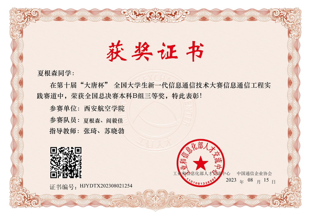 “大唐杯”大学生移动通信5G技术大赛全国一等奖