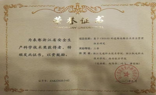 浙江省安全生产科学技术三等奖