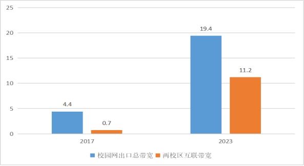 2020年与中国电信合作,对学生宿舍区校园网进行升级改造,校园网出口总带宽从2018年的4.4G提升到了19.4G,两校区互联带宽由0.7G提升至11.2G,信息点位数由2018年的5049个提升到现在的8044个,校园网日均在线人数10000余人。